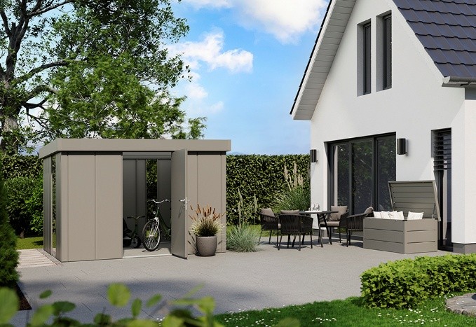 Domki ogrodowe JUNO powstały z myślą o tych, którzy cenią porządek, wygodę i estetykę. To doskonałe miejsce na kosiarkę, narzędzia, rowery, poduszki czy leżaki – wszystko to, co latem warto mieć na wyciągnięcie ręki. Dzięki wielu wymiarom i wariantom dachów można łatwo dopasować je do stylu zabudowy i wielkości ogrodu. Domki dostępne są w 14 wielkościach z dachem dwuspadowym oraz 11 wymiarach z dachem jednospadowym lub płaskim. Do wyboru są trzy kolory oraz efektowna wersja BiColor z dachem i drzwiami w innym kolorze niż pozostałe elementy. Domek można także wyposażyć w pionowe przeszklenia od podłogi do sufitu, które naturalnie doświetlają wnętrze i dodają mu elegancji. W ofercie znajdują się również praktyczne akcesoria – m.in. panel elektryczny z oświetleniem LED i gniazdami, idealny do ładowania roweru elektrycznego czy pracy z elektronarzędziami. Bardzo ciekawą opcją jest też zadaszenie boczne do domków z płaskim dachem. Występuje w 6 rozmiarach i tworzy przytulne, osłonięte miejsce do wypoczynku.